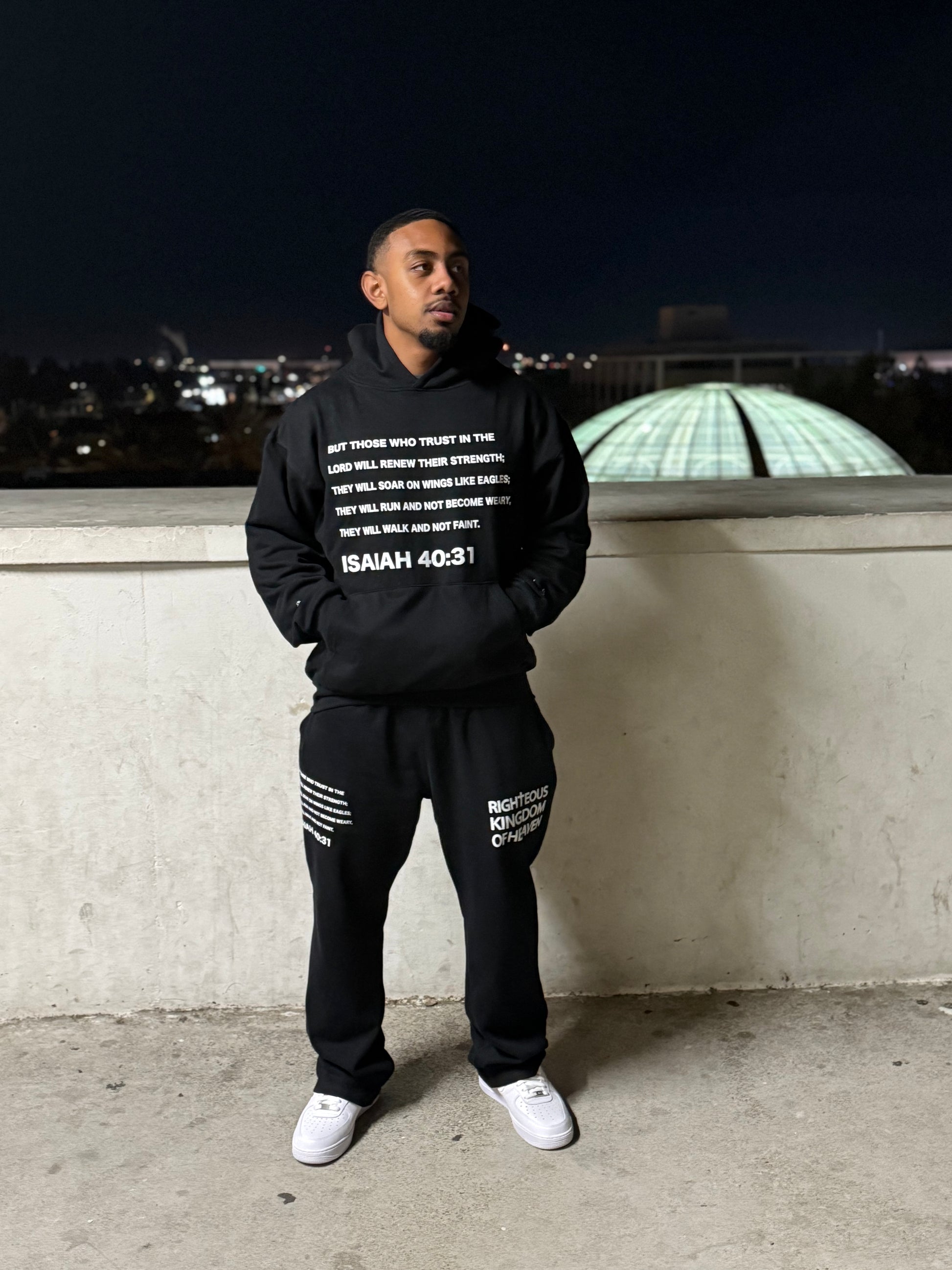 The RKH Isaiah 40:31 black set offers a strong and powerful way to share the message of faith. Crafted for comfort and durability, this set features an amazing scripture Isaiah 40 31 prominently in the front. This displays strength and boldness to spread God’s word effortlessly throughout the supporters day. Its black and white tone provides a classic, versatile look that complements any wardrobe while inviting meaningful conversations grounded on God's principals throughout his word. Ideal for those dedicated to faith-based outreach, this set balances style with purpose.
